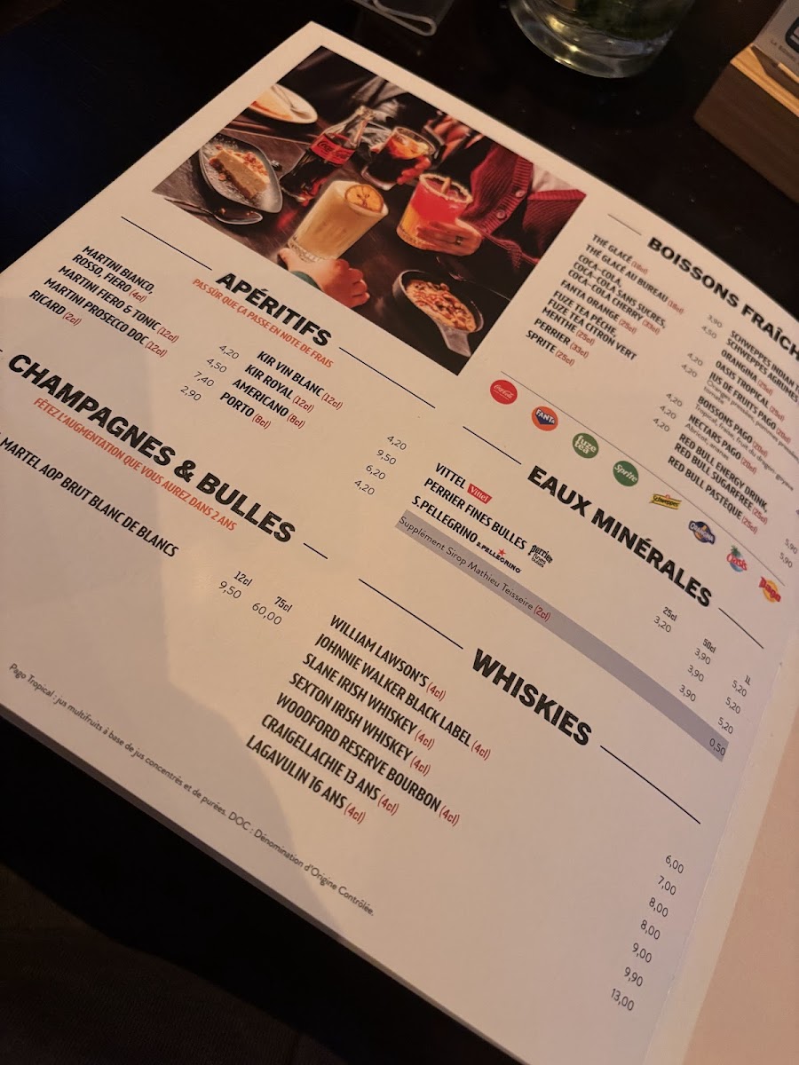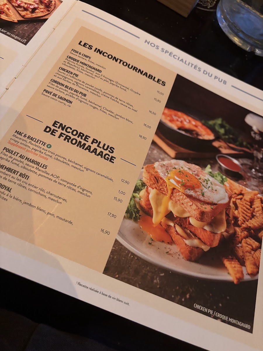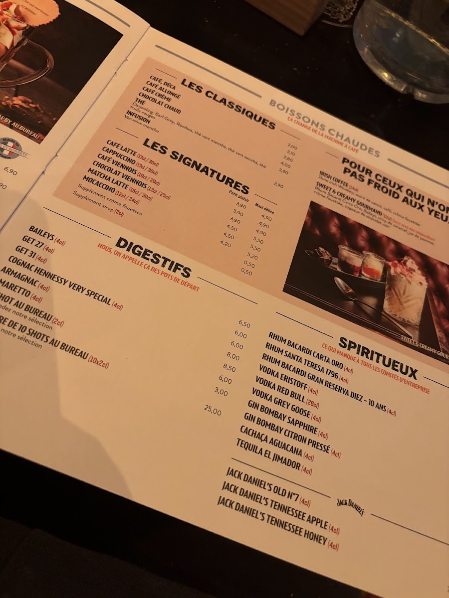 Signature dishes like the Poulet au Maroilles and Camembert rôti evoke warm, rustic flavors with expertly paired sides. Complementing these dishes, the drink menu boasts comforting hot beverages, from classic Irish Coffee to the decadent Sweet & Creamy Gourmand, perfect for a cozy evening. The attentive staff and lively atmosphere make every visit memorable, blending casual charm with refined taste.